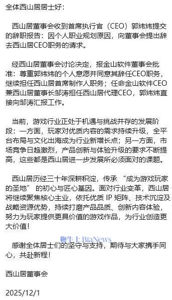 全体西山居居士好:西山居董事会收到首席执行官(CEO)郭炜炜提交的辞职报告:因个人职业规划原因,向董事会提出辞去西山居CEO职务的请求。