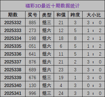 开奖回顾:福彩3D上期开奖号为996,和值为24,跨度3,其中奖号大小比为3:0