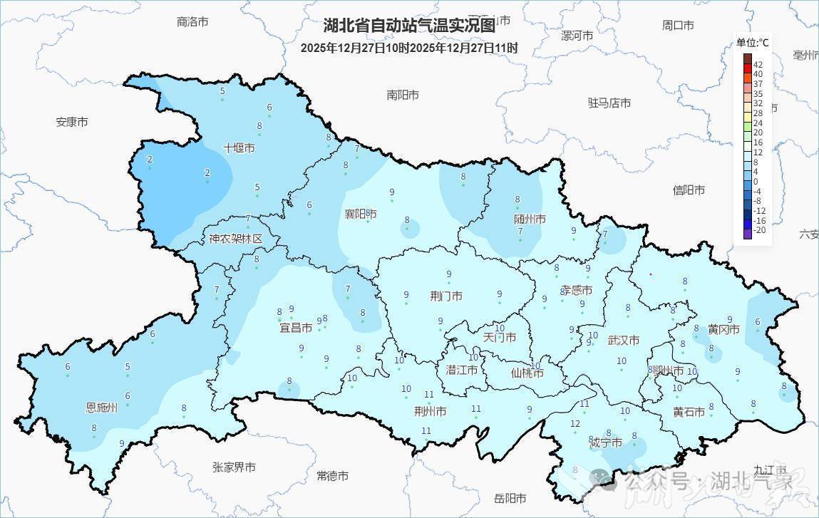 27日,湖北“冻感”开场白:辐射降温把北部地区最低气温压到-5~-1℃,郧西-3.4℃、竹溪-2.6℃,早起出门像开冰箱门;南部地区稍温柔些,-1~2℃也够人缩脖子。好在白天太阳上岗,上午11时气温比26日暖了2℃,瞬间驱散寒意。